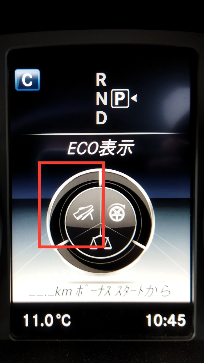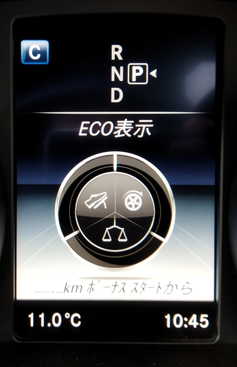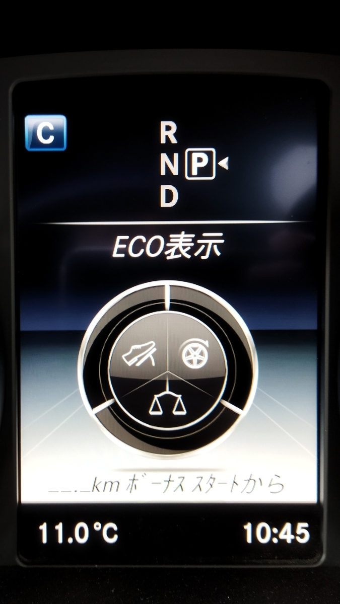 これはECO表示と呼ばれるものだそう。Cクラス乗りだけどよく知らない、と言う方も多いのではないでしょうか。