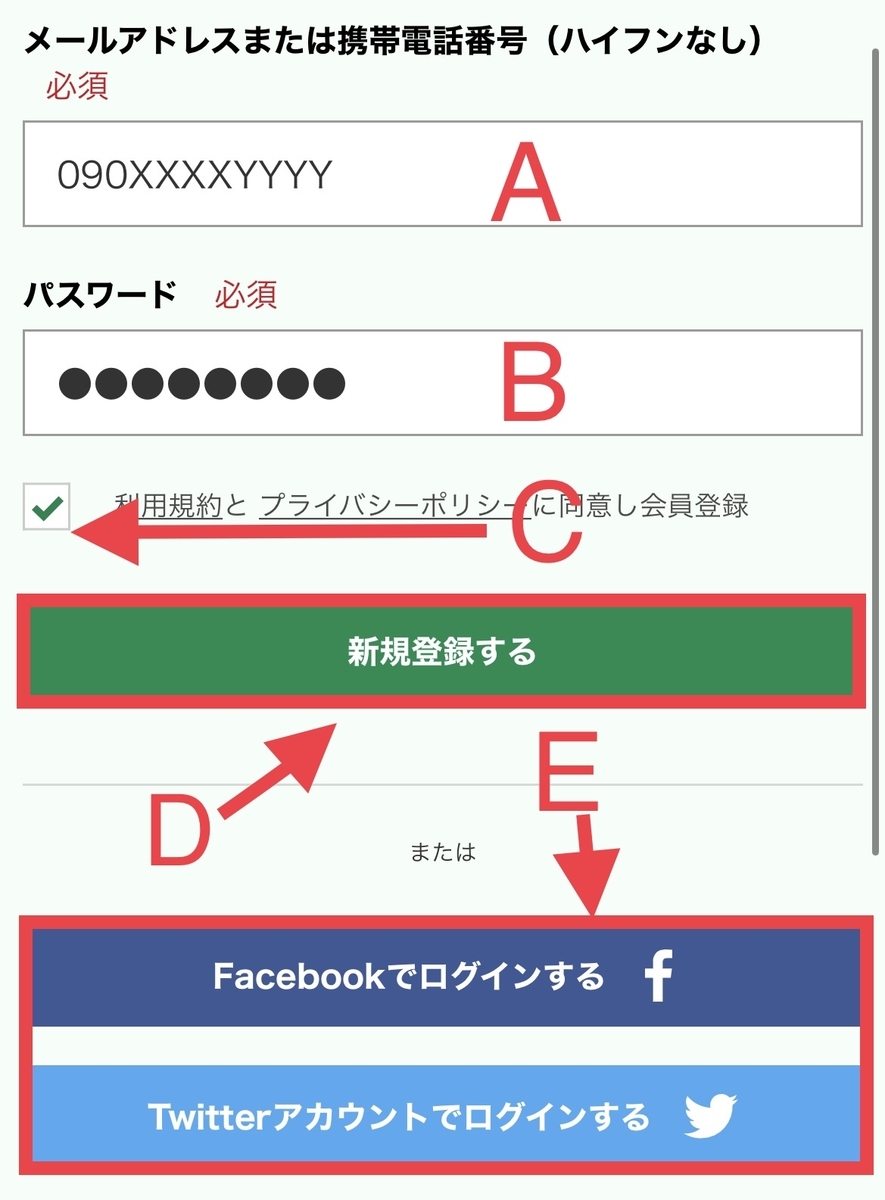 登録にはSMS認証が必要です。電話番号を入力し、SMSで受信したコード(4ケタ)を入力します。まずは電話番号を入力しましょう。