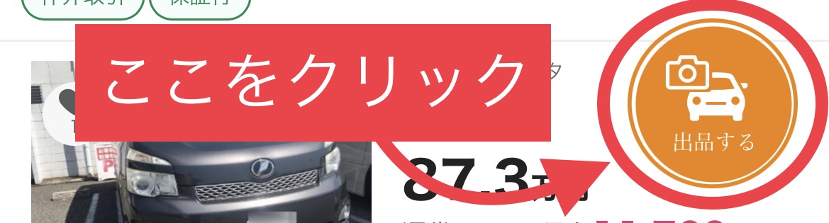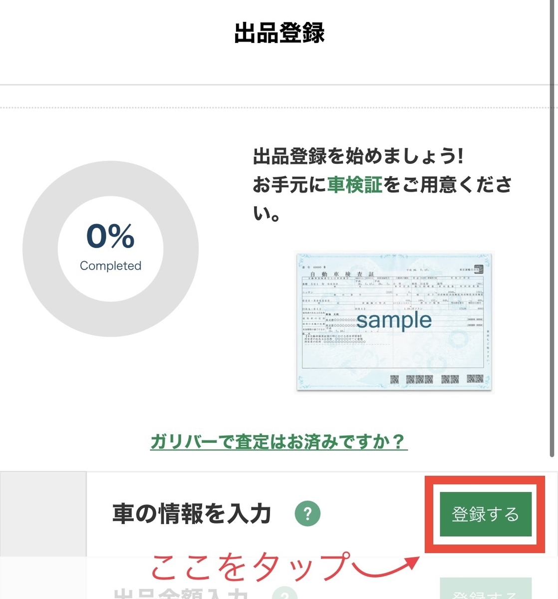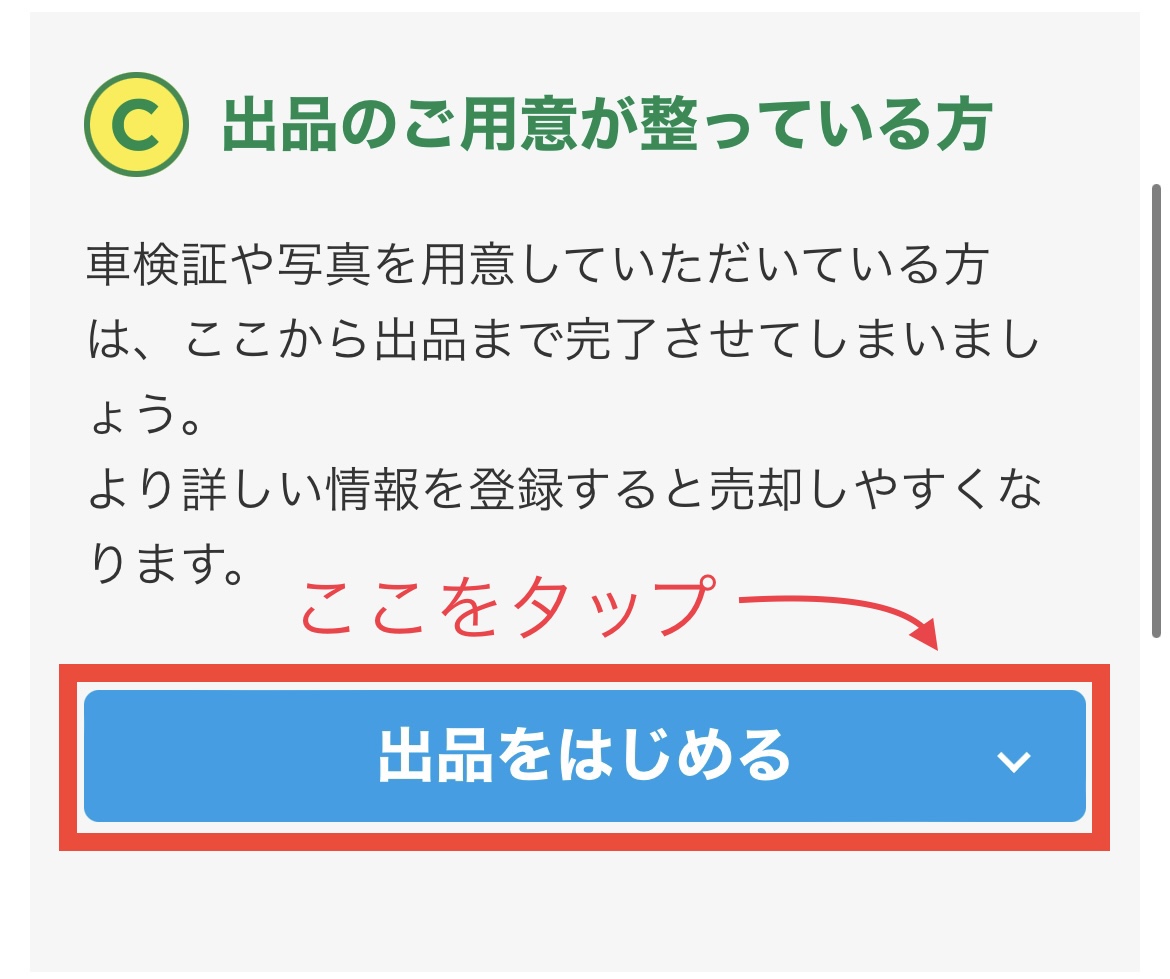 ページ下の方へスクロールすると、以下のような画面があります。まずは車検証を手元に準備して、水色のボタンをタップしましょう。出品登録画面に進みます。