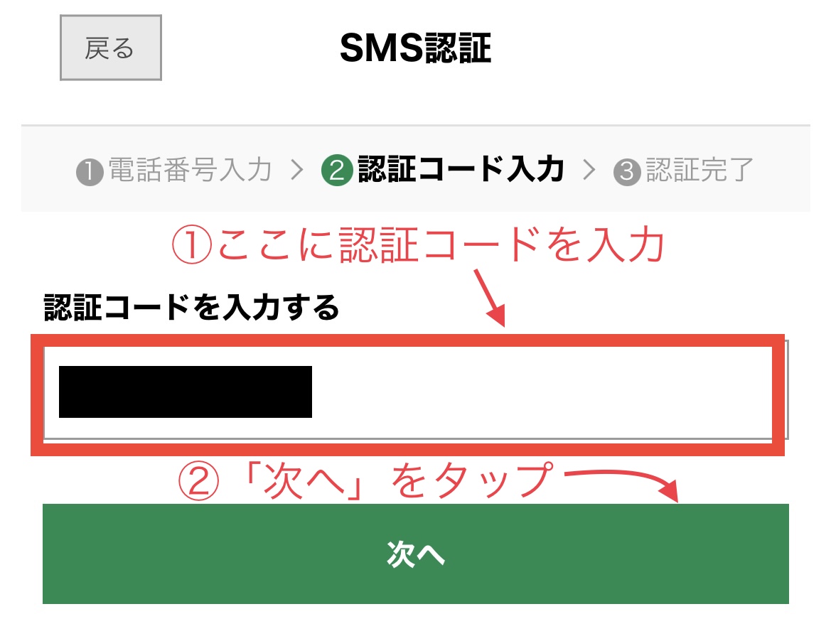 ①SMSで受信したコードを入力し、②「次へ」をタップします。