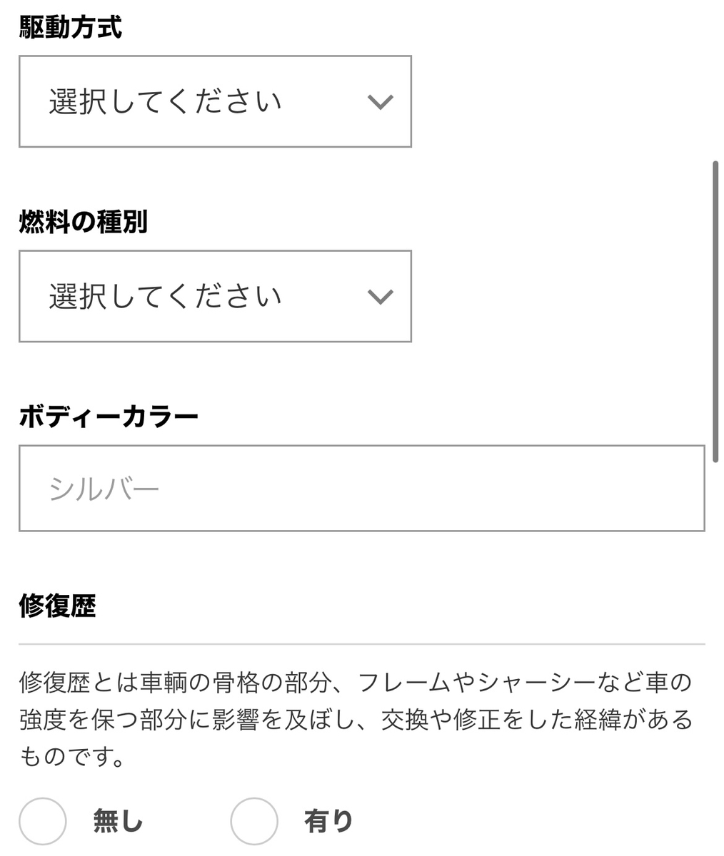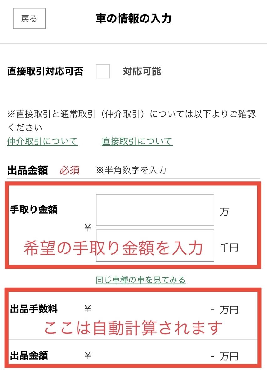 出品登録のページでは「車の情報」「出品金額」「車の画像」「オプション•説明」「傷」を記載する項目がありますので、それぞれ正確に記載していきましょう。