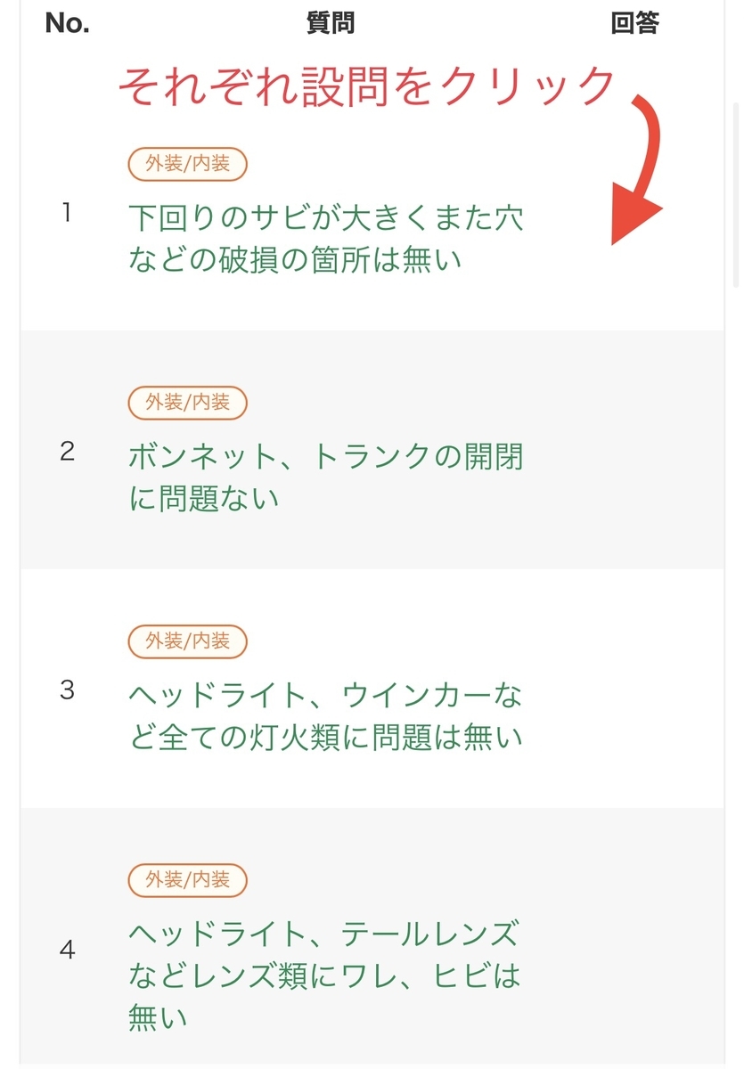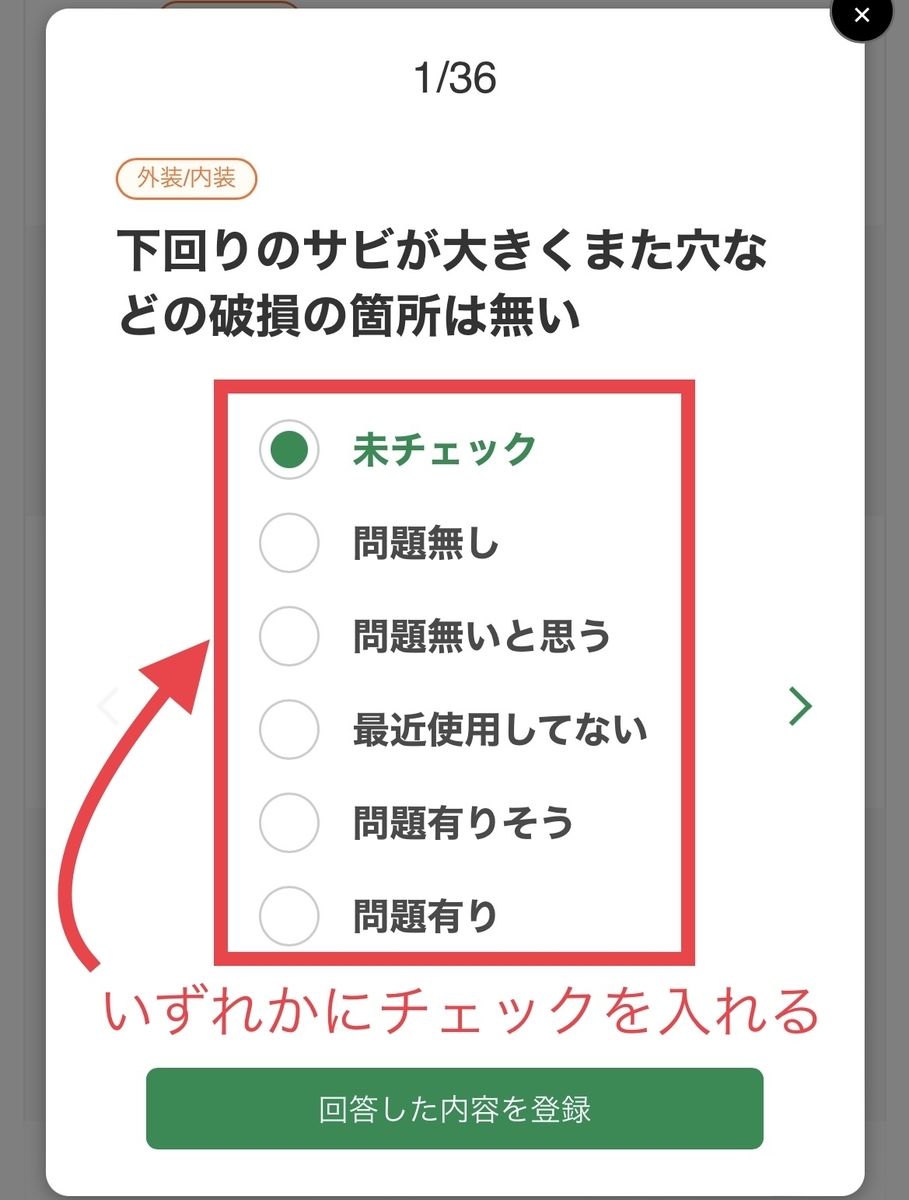 次に進むと、車の画像をアップロードする画面が開きます。車両の状態がよく分かる写真を選んでアップロードしてください。また、車両の状態に関する質問が36問あります。出品車両の状態は明確な方が売れやすくなります。なるべく回答するようにしましょう。
