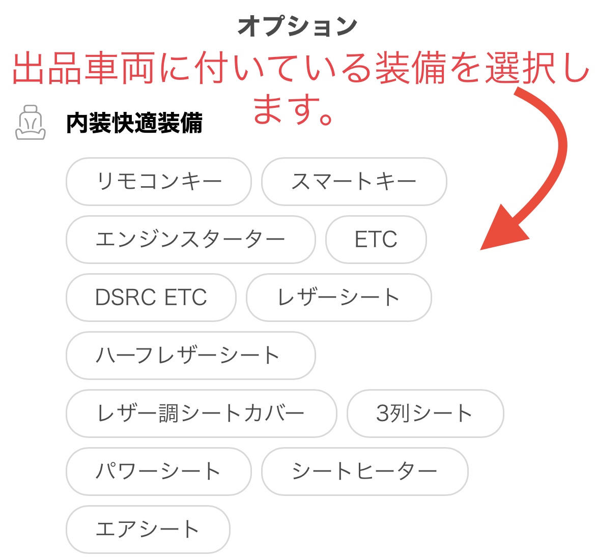 車の状態が入力できたら、最後にオプションや説明文の編集を行います。出品する車のオプション装備など、アピールポイントを出来るだけたくさん書き、魅力が伝わるようにしましょう。