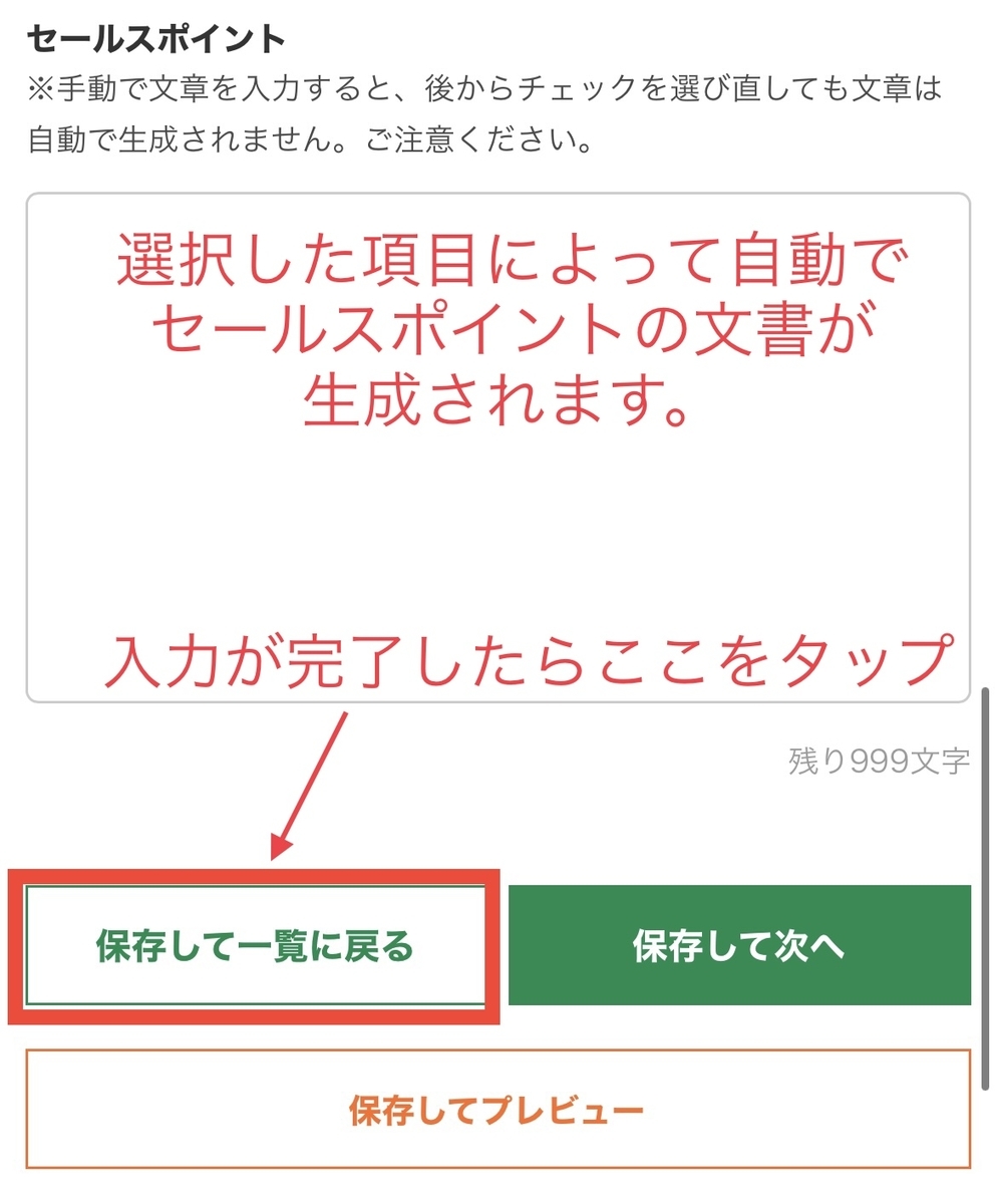 入力欄を一番下までスクロールすると、下のような画面になります。入力した項目に沿って自動でセールスポイントの文書が生成されます。問題なければ「保存して一覧に戻る」をタップしましょう。