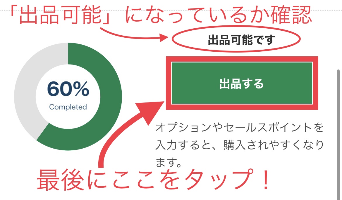 一覧に戻ると、何パーセントの項目が入力できたか円グラフで表示されます(下の画像では全て入力していないので“60%”となっています)。出来るだけ100%に近い方が望ましいですが、右上に「出品可能です」と表示されていれば問題ありません。
