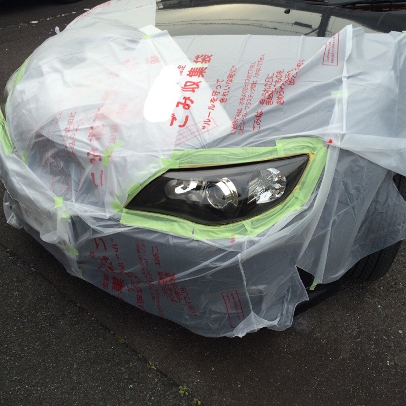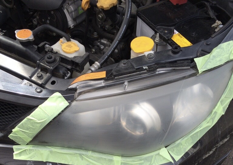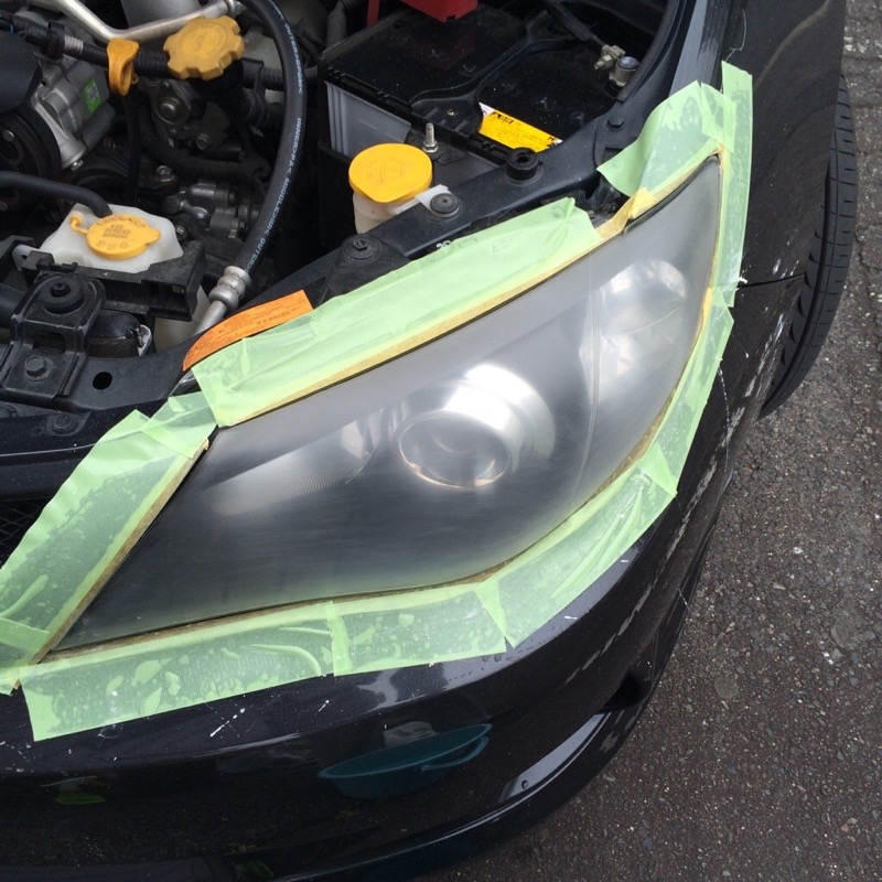 まず最初はマスキングを行います。ヘッドライトの周りに傷が付かないよう養生テープを使ってマスキングします。