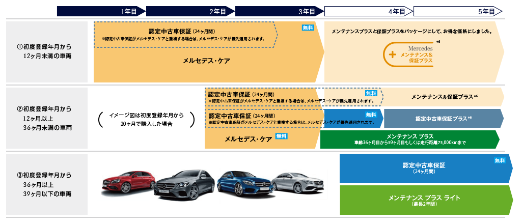 - メンテナンス・保証プラス メルセデスケア終了後の2年間、定期メンテナンスと修理の保証を延長できる有償のプログラムです。このサービスに加入するには、メルセデスケアの対象車両であり、かつ1回目の車検前(新車登録から35ヶ月以内)までに申し込む必要があります。 中古車であってもメルセデスケアの継承手続きさえしてあれば加入できますが、一番安いAクラスの加入料金でも25万円ほどかかります(2019年時点)。