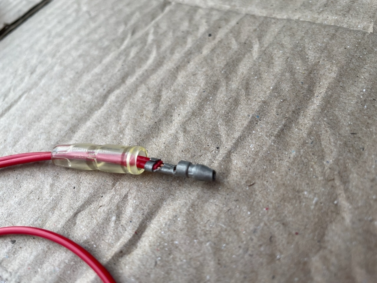 エレクトロタップは使わず、ギボシ端子で繋げますので、ホーンに繋げるための配線を作ります。こんな感じで分岐線を2つ作りました。車体側は丸型、ホーン側は平形のギボシ端子で接続します。